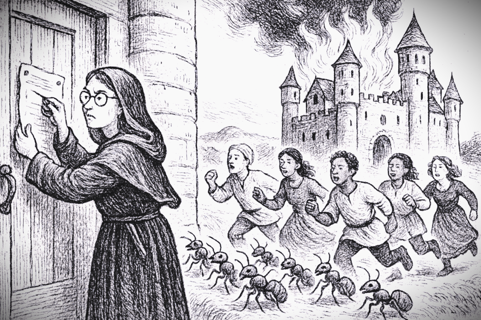 A humorous sketch of software chaos: bug armies, panicked devs, and one very determined heretic.