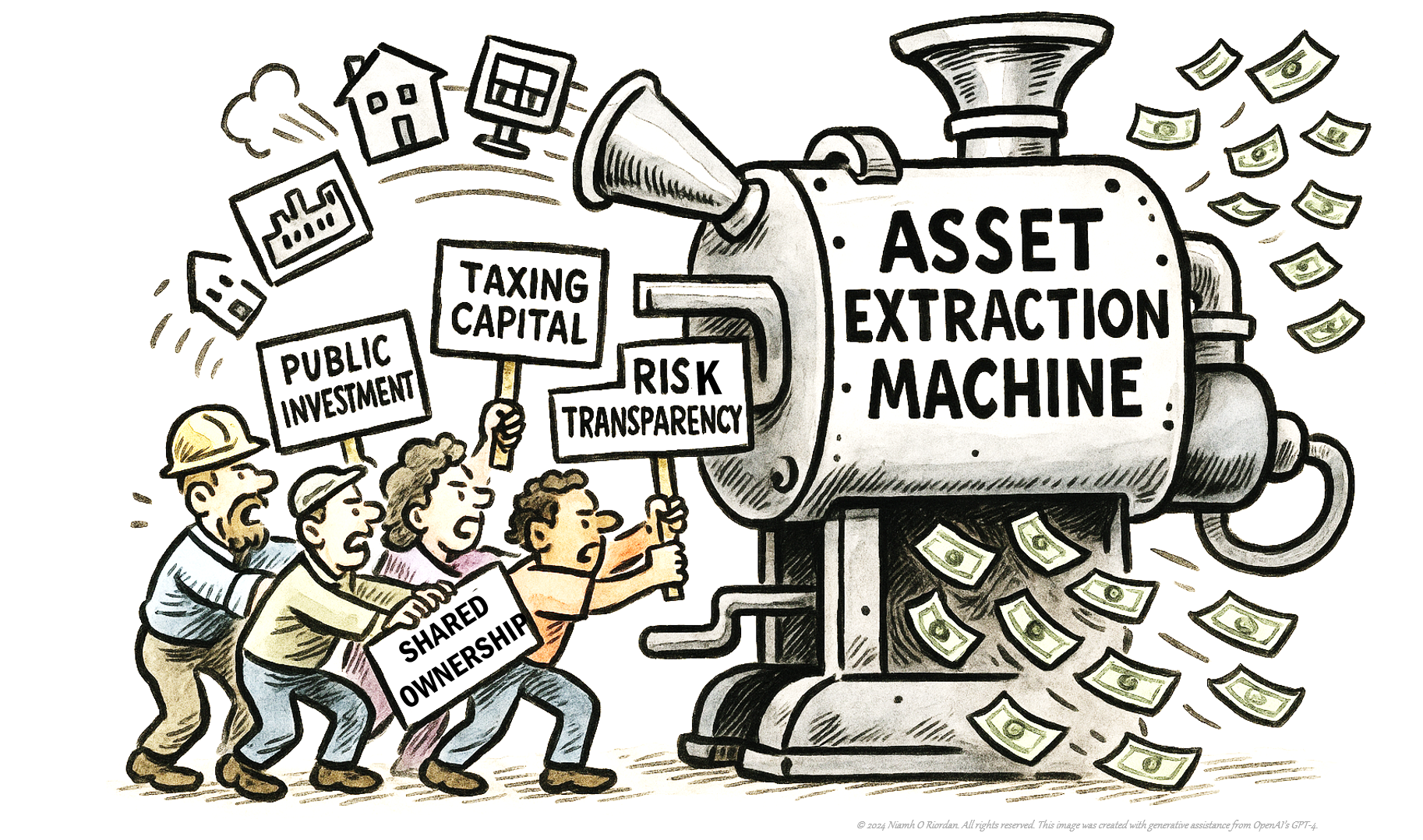 The foundational concept of this piece: a system where economic power comes from what is owned, not what is done. As stocks, housing, data, and infrastructure become assets, labour becomes marginal. What looks like stagnation is often redistribution—upward.